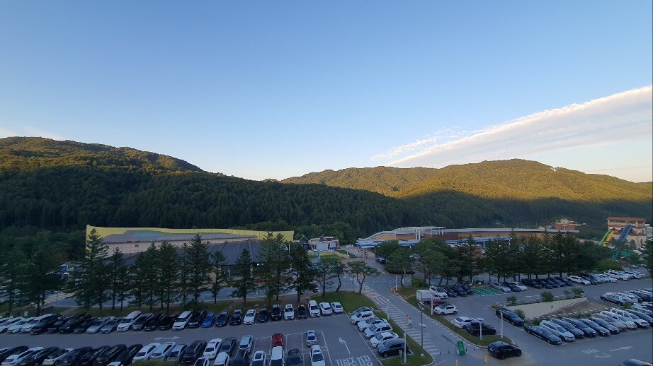 저희는 이번에 그린동으로 배정 받았는데요. 코로나 기간동안 객실들 리뉴얼을 진행하더니 블루동은 모두 리뉴얼이 끝난 모양이었습니다. 숙소에 도착해서 창밖으로 바라본 풍경이 너무 이쁘고 가슴을 탁 트이게 했습니다.