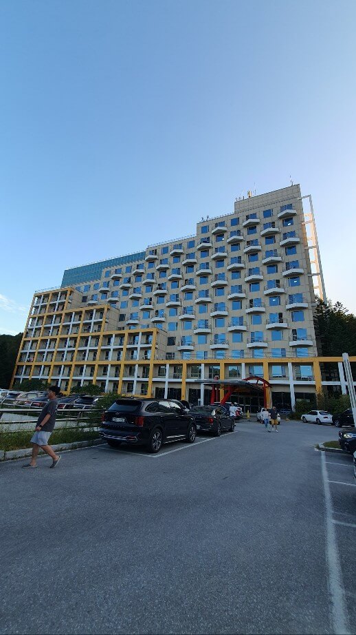 도착하면 블루동, 그린동, 옐로우동이 휘닉스 평창이며 뒤쪽으로는 빌라형 큰 객실이 있습니다. 옆쪽에 분홍색으로 똑같이 생긴 건물은 한화 콘도라고합니다.